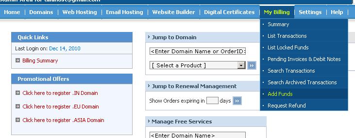 3 - به کنترل پنل دامنه وارد شوید و از منوی My Billing روی Add Funds کلیک کنید.